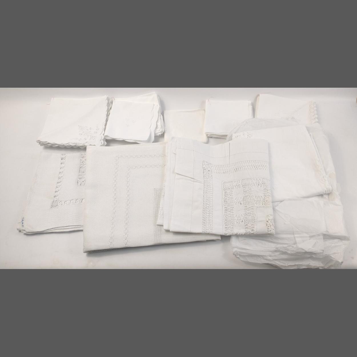 A quantity of linen tablecloths with cut work designs and napkins