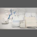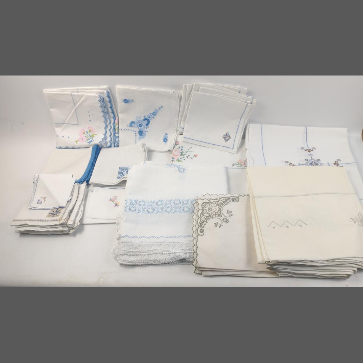 A collection of table linens mainly decorated in shades of blue embroidery, with napkins