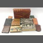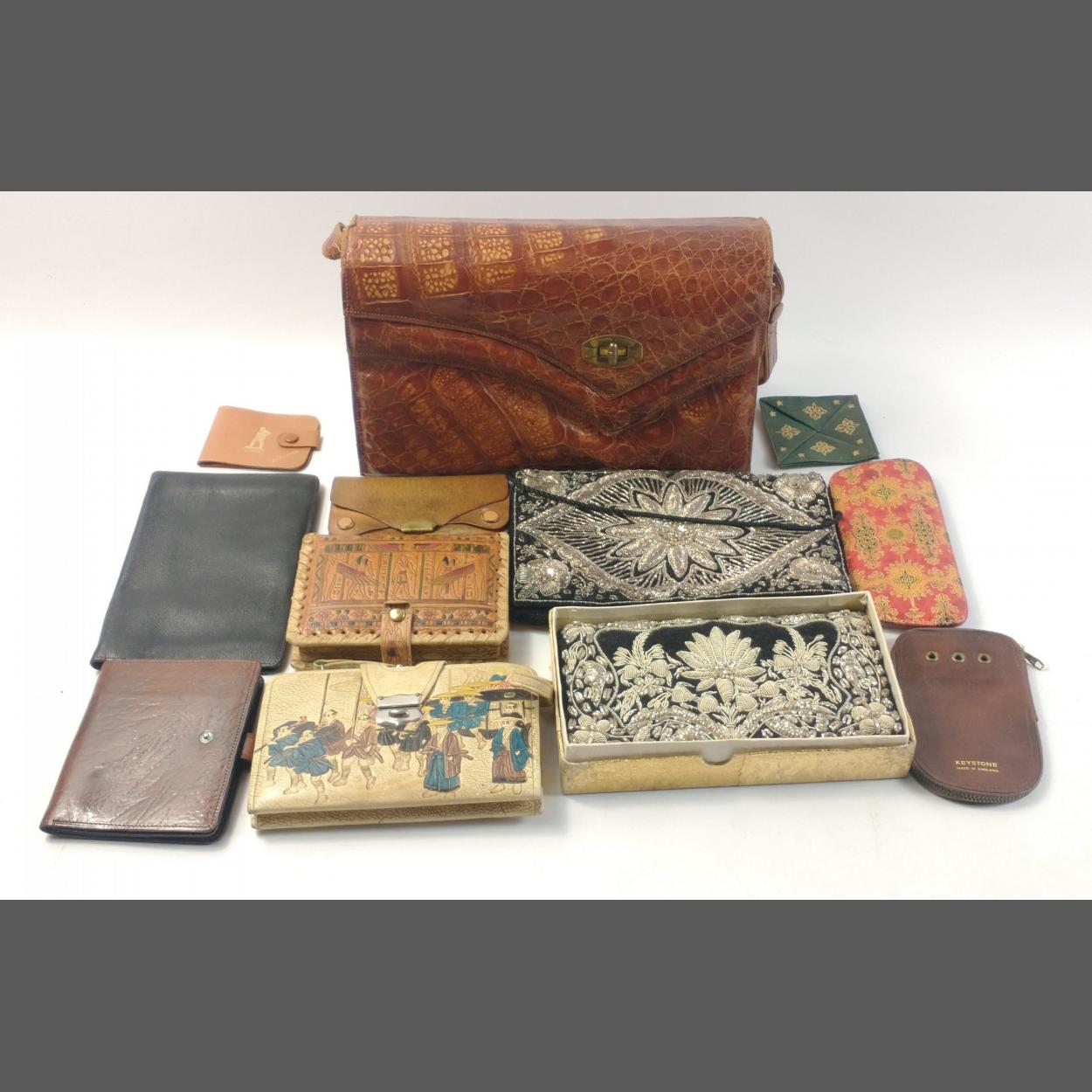 An interesting lot consisting of a crocodile leather handbag (26x18x8cm approx), 2 black velvet evening bags with metalwork embroidery (1 boxed), a lavishly decorated leather specs case and various purses and wallets