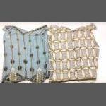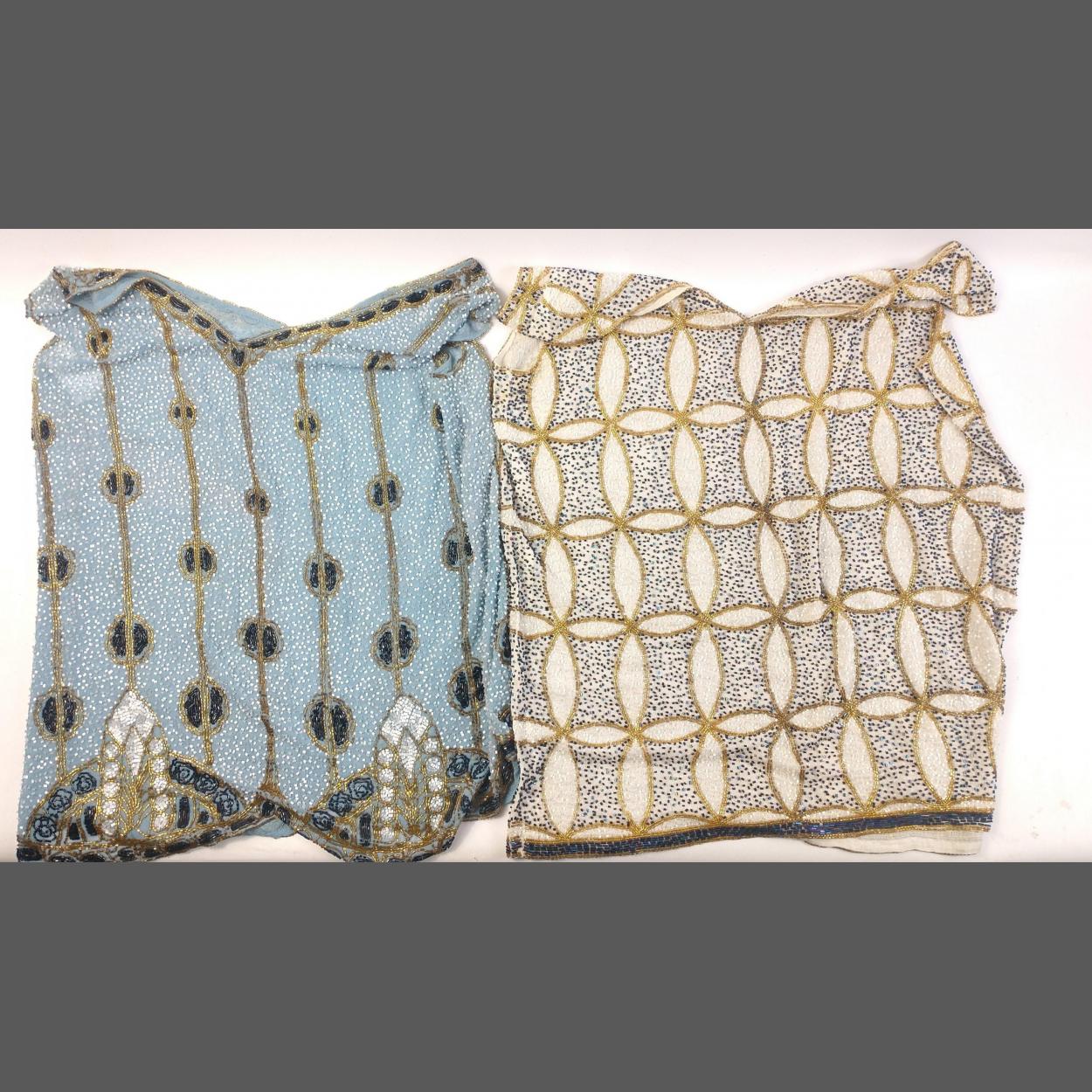 Two sleeveless heavily beaded evening tops; one with a blue background with gold and navy beading, 85cm chest approx, the other 90cm chest approx (EUR 46)with a white background and heavy beading in gold and navy geometric shapes, made in France