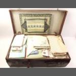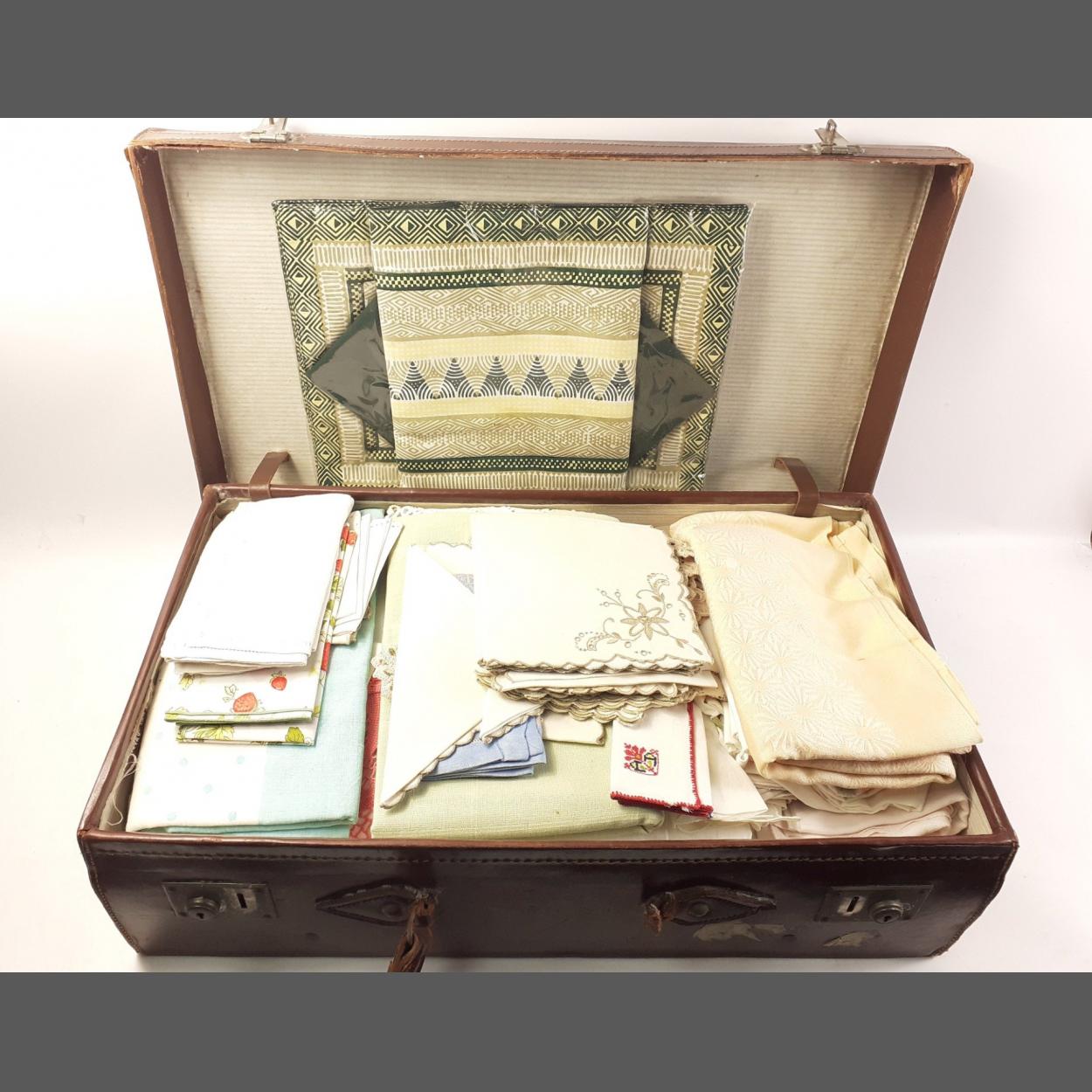 A vintage suitcase jammed FULL of vintage linens to include embroidered tablecloths, napkins, crocheted doilies, pillowcases, and an unopened set of table mats and napkins from Zimbabwe