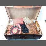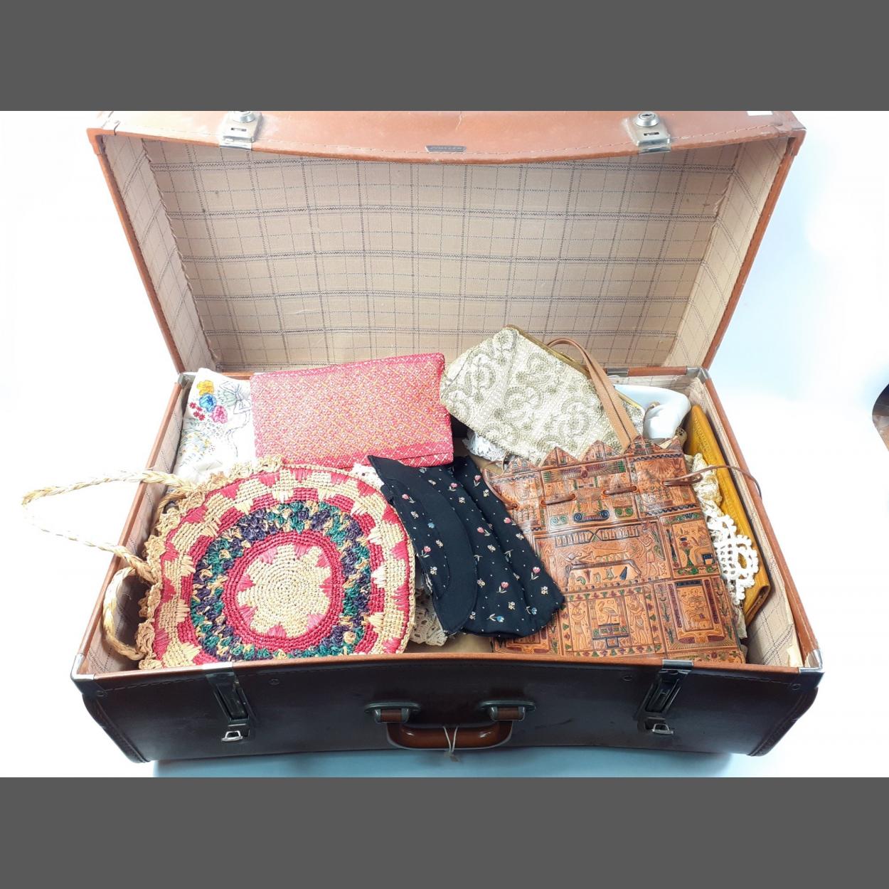 A suitcase with interesting contents to include beaded evening bags, and some vibrant heavily fringed shawls