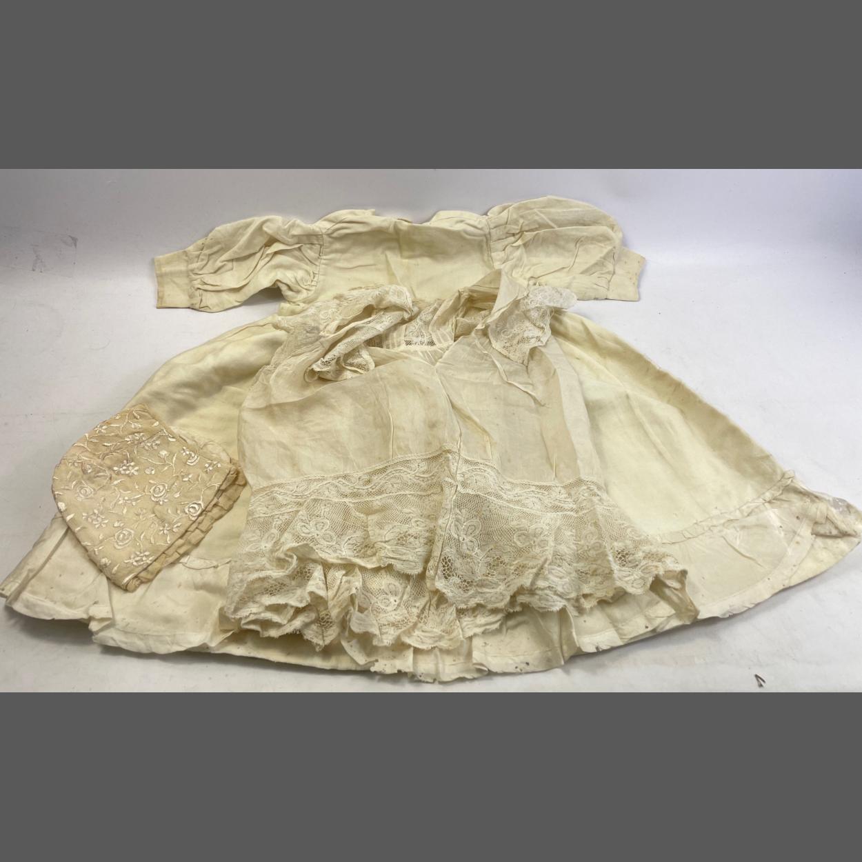An antique child's dress in finest silk and lace chest approx 74cm, length approx 40cm, plus a fully lined dress with silk frill 60cm chest approx and 58cm length approx, and a small babies cap. Some moth damage on the silk