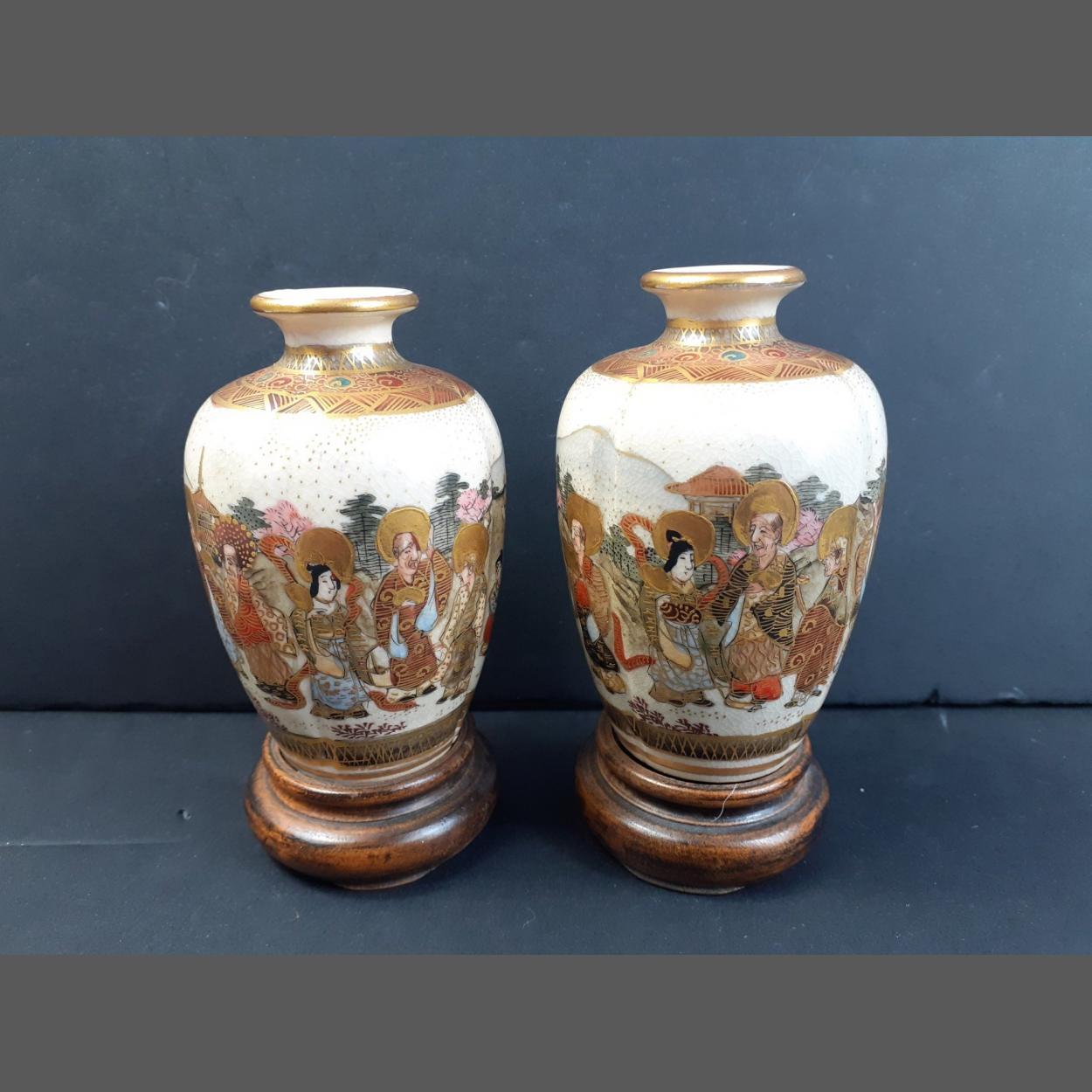 A beautiful little pair of older Japanese SATSUMA vases on wooden bases. Each standing 12cm high approx and in lovely undamaged condition.