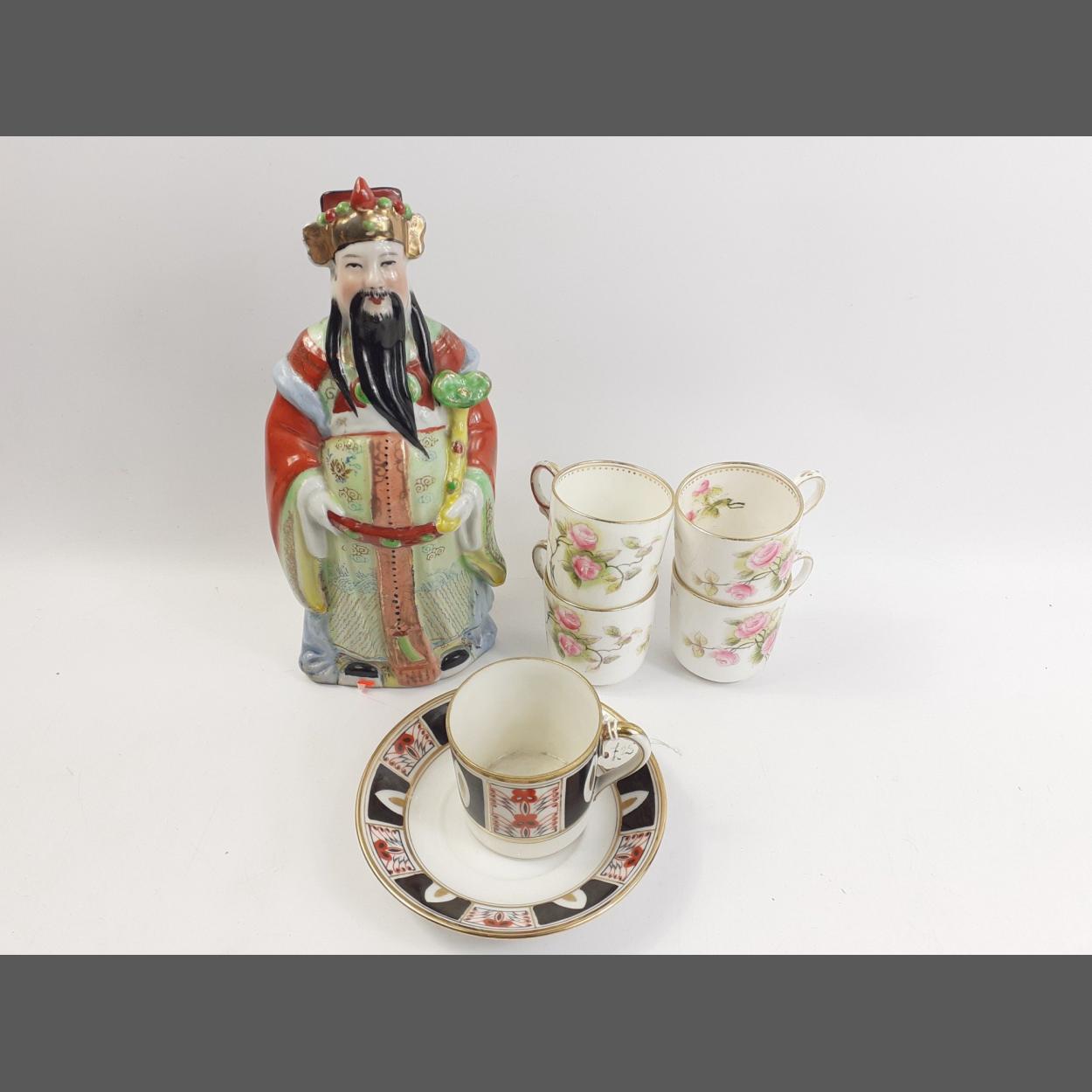 A small ceramic lot to include an oriental gentleman statue standing 23cm tall approx. a NORITAKE cup and saucer duo nd four small coffee cans.