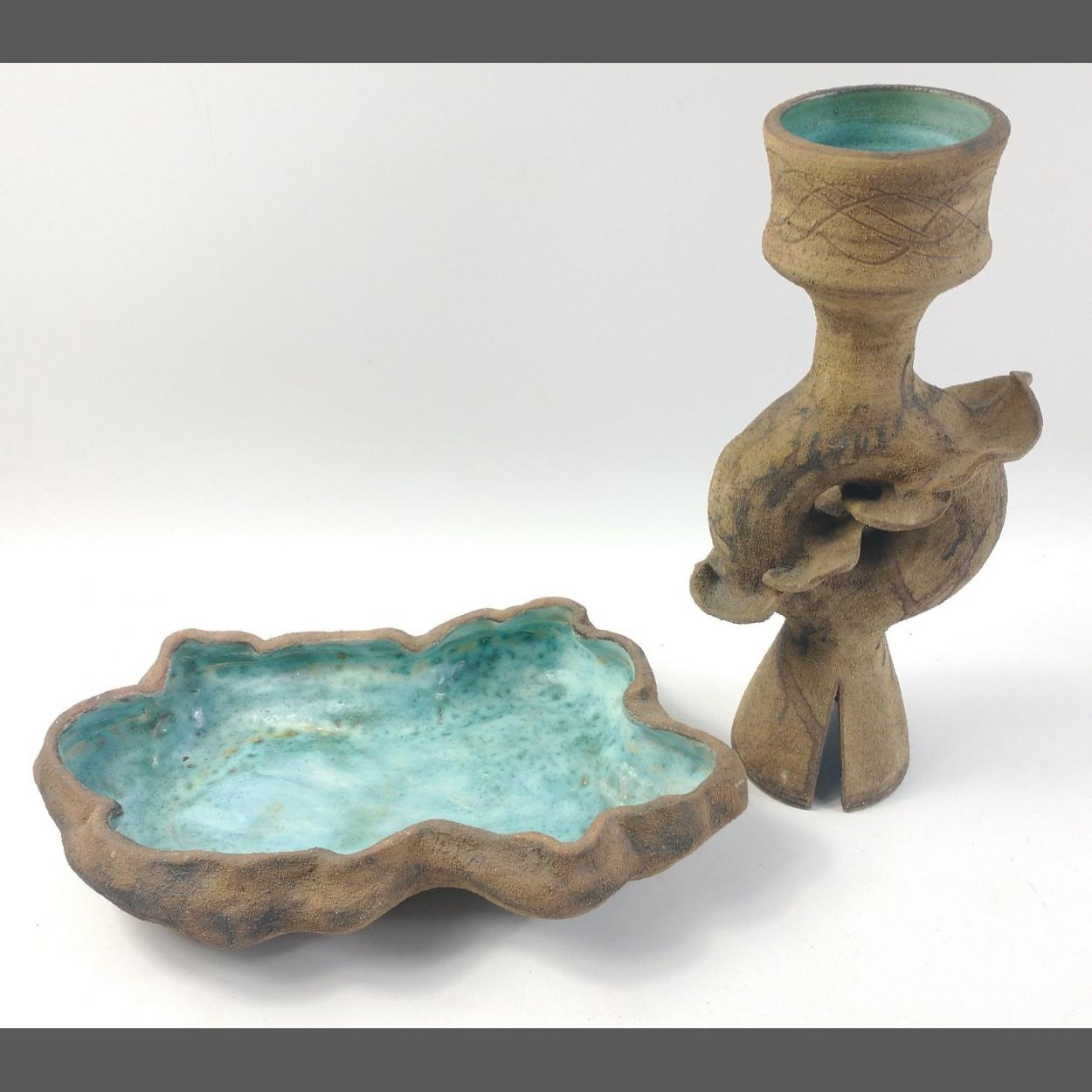 A CLIVE BOOKER brutalist tall Ikebana vase with turquoise inner, stands approx 33cm tall, no damage and a CLIVE BOOKER shallow Ikebana pottery dish with turquoise lining 33cm long