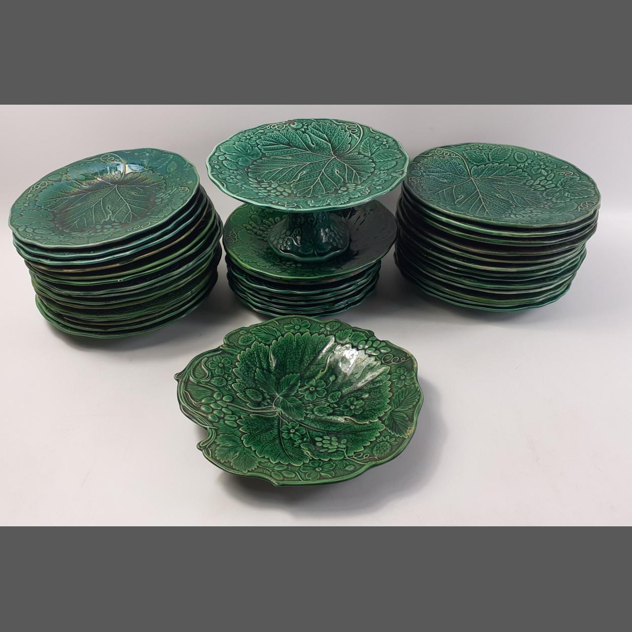 A quantity of vintage Majolica plates with a design of vine leaves and grapes, 28 of 23cm dia, 8 of 20cm dia, 1 shallow bowl of 25cm dia and a cake stand 23cm dia and 11cm high. Some age appropriate scuffs to some plates