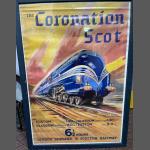 Transportation Railway Train Interest. A stunning large modern RAILWAY PRINT of the LMS CORONATION SCOT in a wooden frame. Measures 107 x 77 cm. Bright vibrant colours and the fantastic deco era illusion of speed from this stunning Locomotive. A great opportunity to aquire a period look at the fraction of the cost of an original.