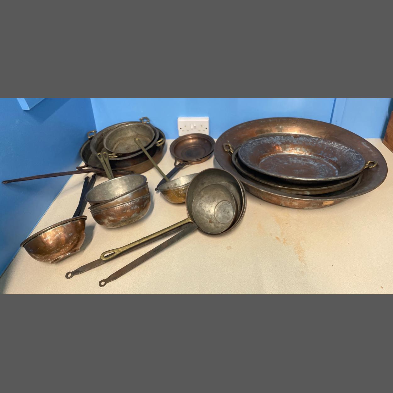 Two vintage warming pans one brass with a wooden handle 20cm dia approx, 75cm length approx, and one copper with a metal handle 19cm dia approx 54cm long approx