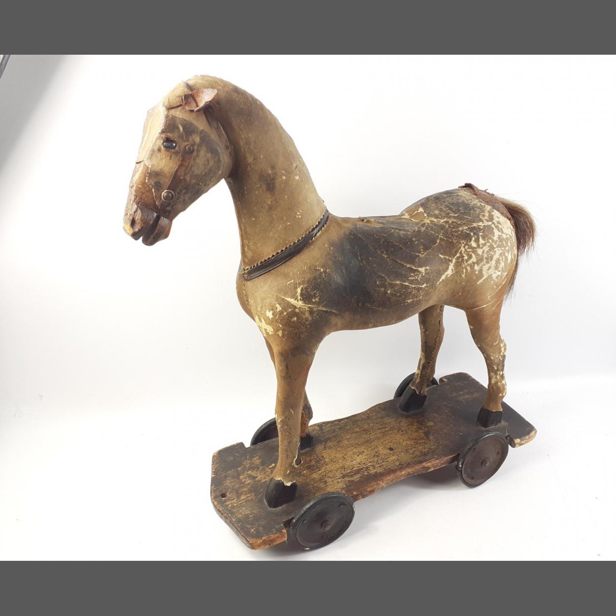 A much-loved Victorian pull along horse made of leather over wood on a wheeled base. This item is in quite a fragile state in need of some TLC. Stands 65cm high and length 52cm