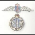 VINTAGE SILVER and enamel sweetheart brooch with stamped makers details for TLM and a Sterling stamped. The " RFC" monogram in blue enamel within a wreath of laurel surmounted by the red enamel inset crown - dimension 3.5cm height 2.5cm with also a VINTAGE RAF white metal wings and crown sweetheart pin badge spanning dimensions 5.5cm approx
