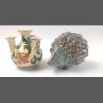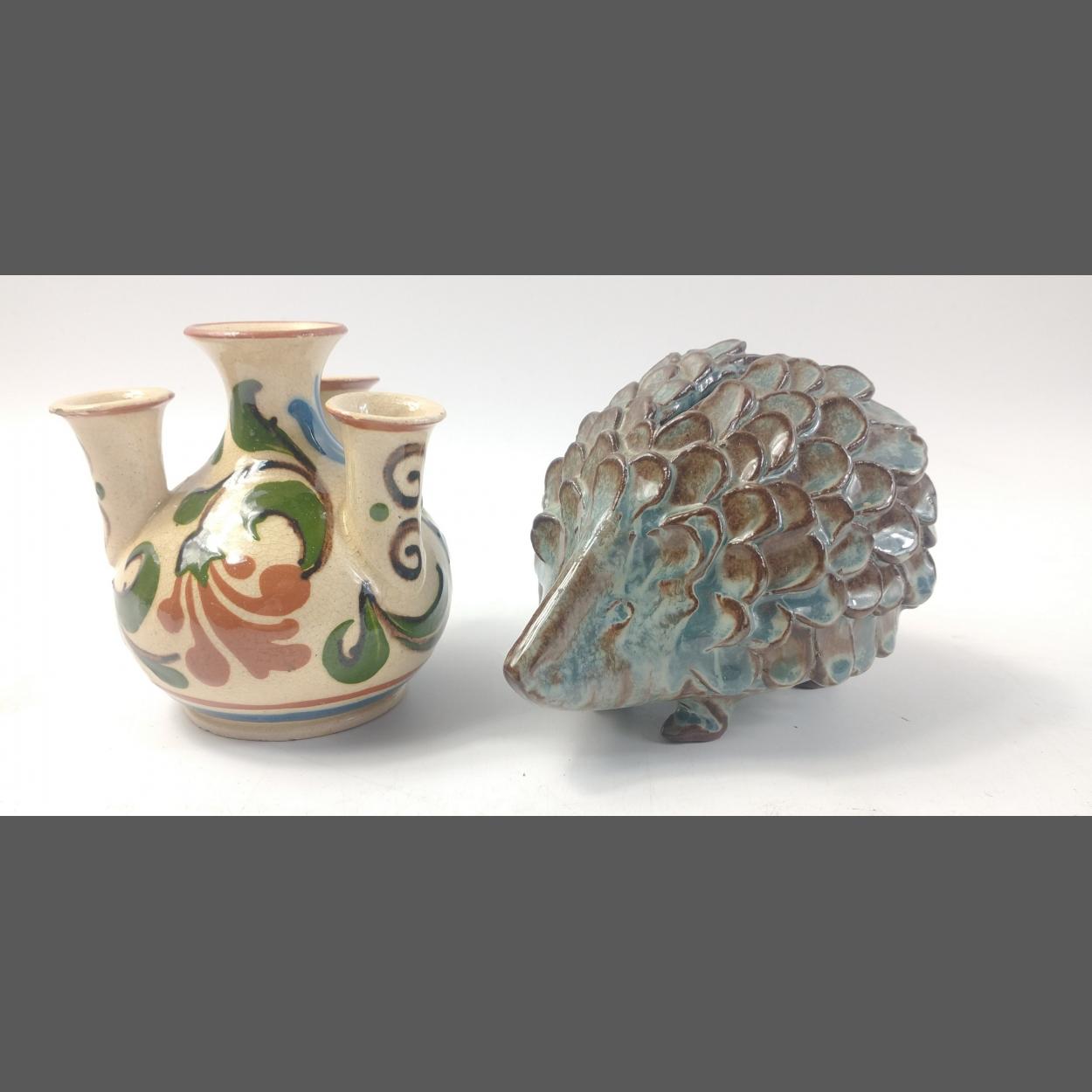 A CUTE studio pottery hedgehog money-bank dimensions 9cm height x 11cm width approx with a small handpainted studio pottery stem vase dimensions 9cm height x 9cm width approx
