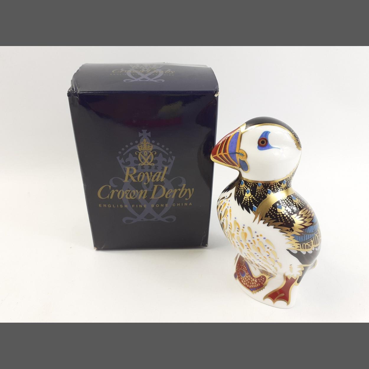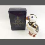 A ROYAL CROWN DERBY Old Imari puffin paperweight with gold stopper, signed by JOHN ABLITT, stands 12cm high, comes in original box, no damage