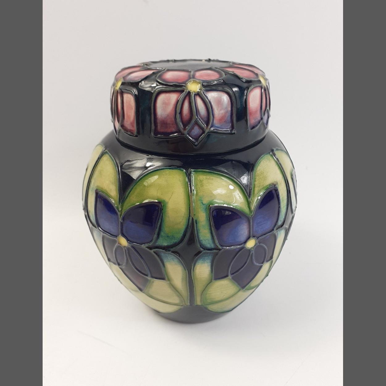 A small MOORCROFT Blue Violet ginger jar, boxed, it stands approx 11cm high, no damage