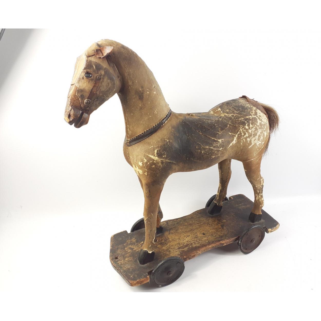 A much-loved Victorian pull along horse made of leather over wood on a wheeled base. This item is in quite a fragile state in need of some TLC. Stands 65cm high and length 52cm