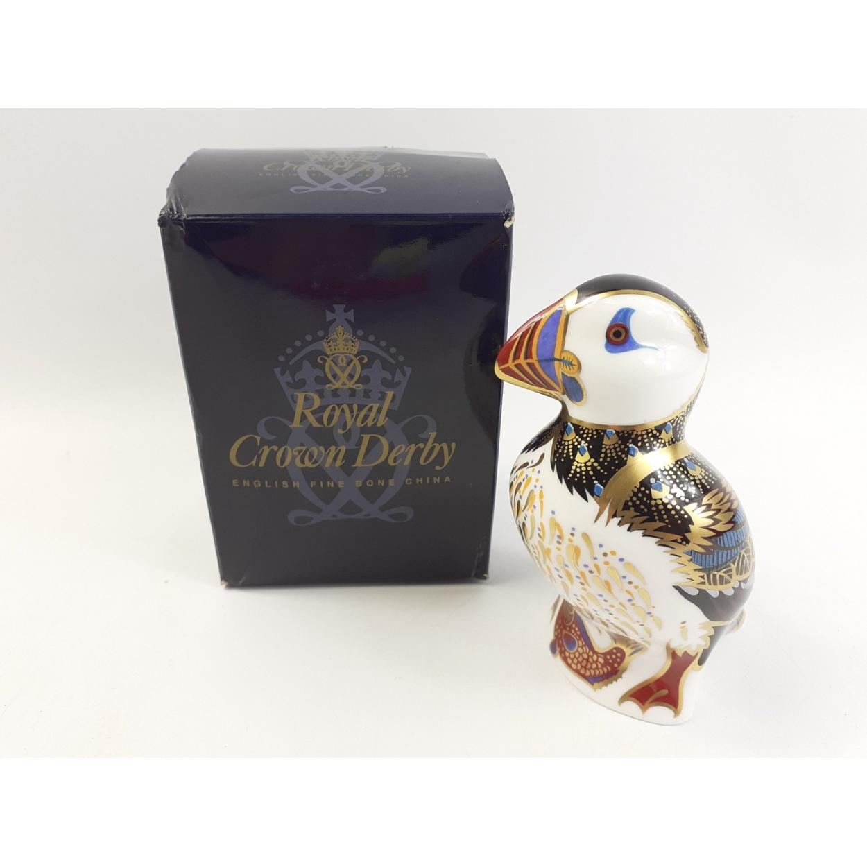 A ROYAL CROWN DERBY Old Imari puffin paperweight with gold stopper, signed by JOHN ABLITT, stands 12cm high, comes in original box, no damage