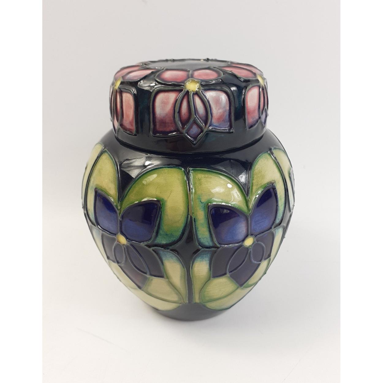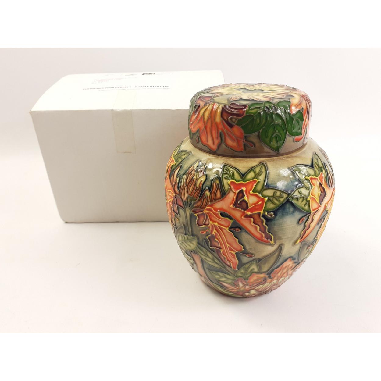 A boxed MOORCROFT Chinese Lantern ginger jar, 16cm high, original price tag reads 'Seconds £241.60'