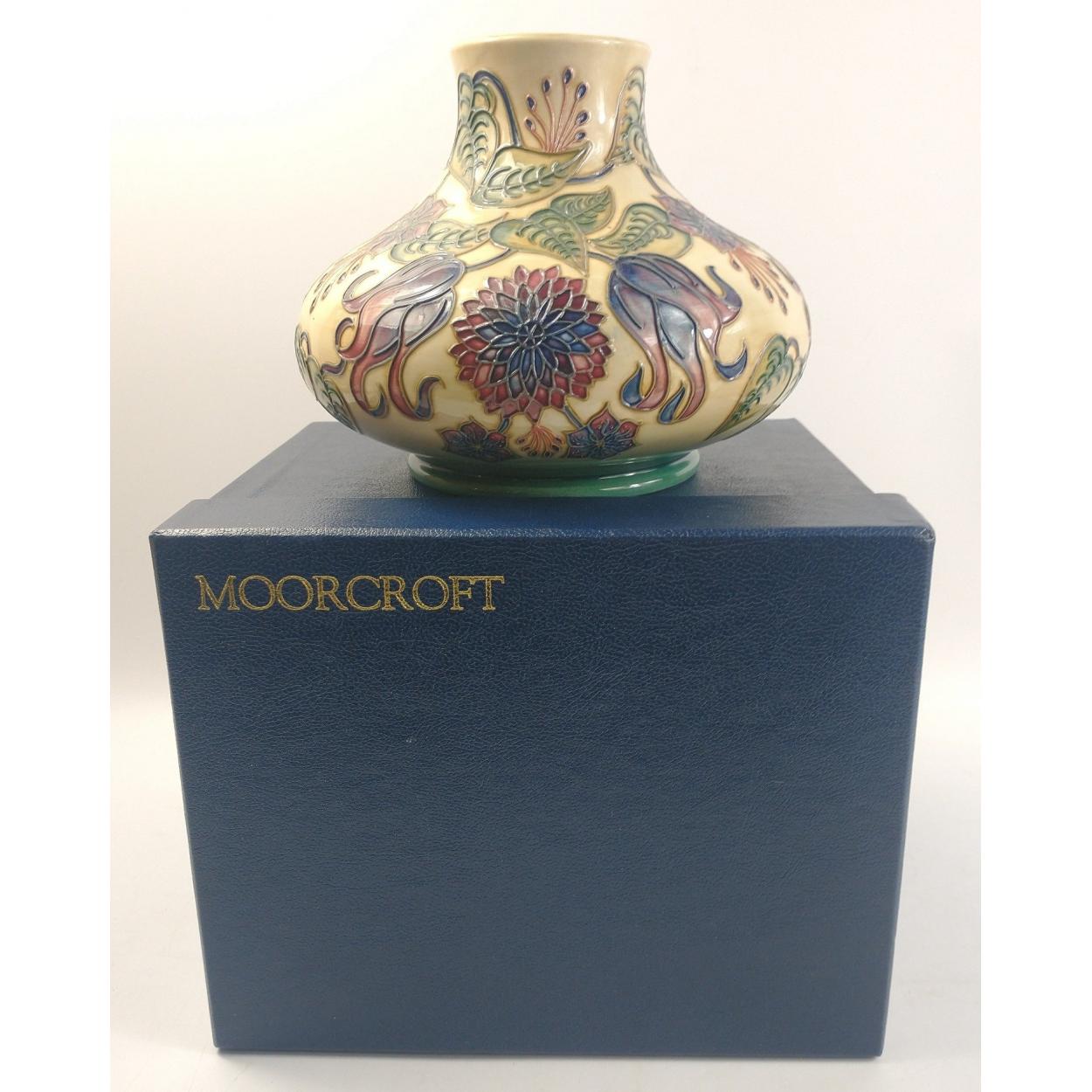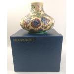 A squat MOORCROFT vase in its original box stands approx 17cm high, label to base reads 'Seconds £420.75'
