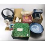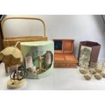 A homeware lot to include a small table lamp, M&S mug tree with six mugs, wicker magazine rack, foldaway rubbish bin, and a boxed set of 18 smoky Skipper glasses
