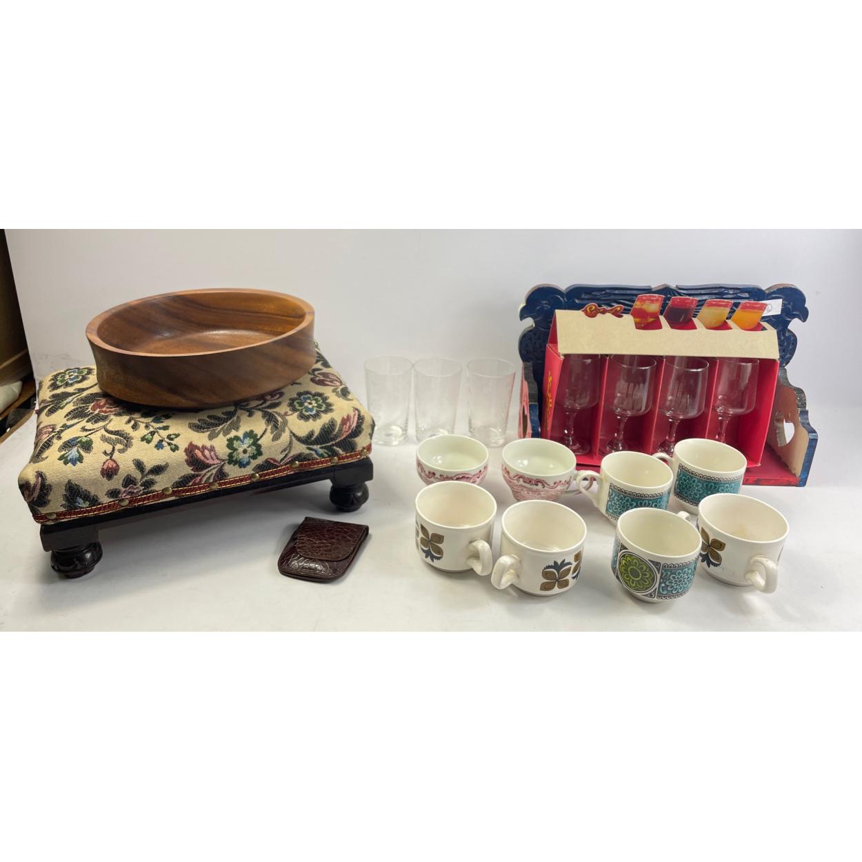 A domestic lot comprising a teak fruit bowl 25cm dia, a box of 6 hi-ball glasses, 10 boxed wine glasses, 8 assorted vintage teacups, a small wooden shelf 36cm W x 25cm H approx and a small footstool 34x28x13cm