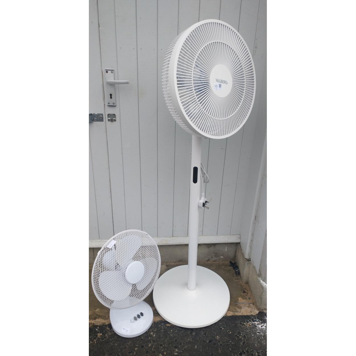As new - a free-standing electric VALBERG fan with remote control approx 130cm high plus a table top fan
