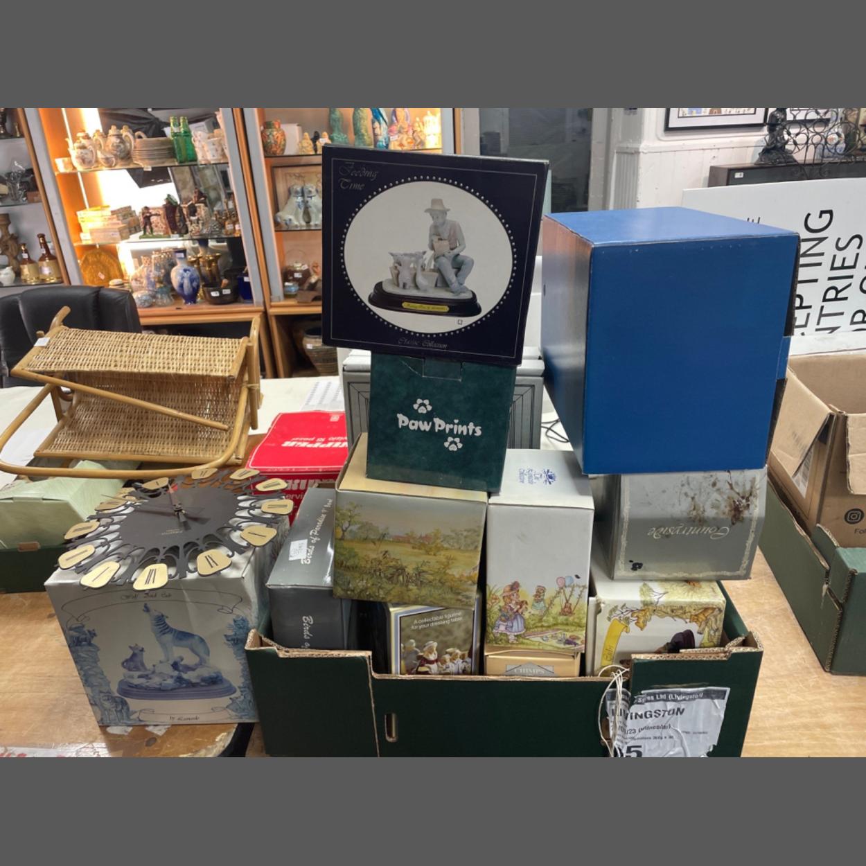 A mixed box of ceramics, 2 boxed mantle clocks, various ornamental figures etc
