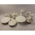 A HOSTESS TABLEWARE tea service in white with rosebuds and gilt rim comprising 10 teacups, 10 saucers, 10 side plates, 1 milk jug, good condition