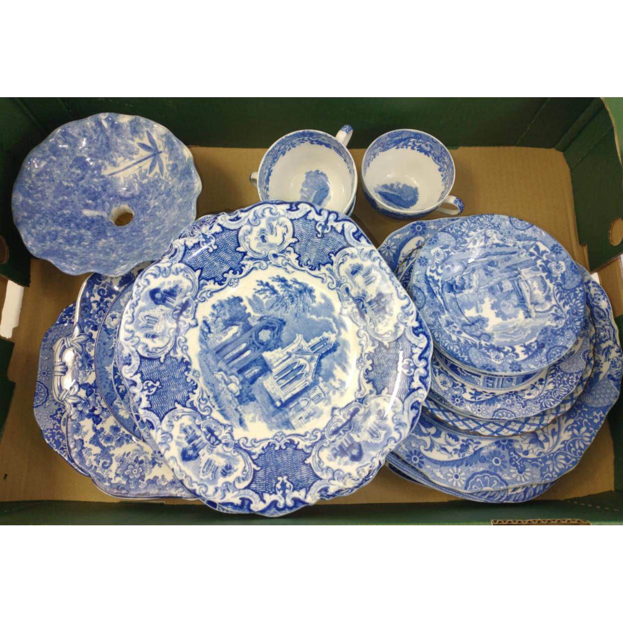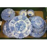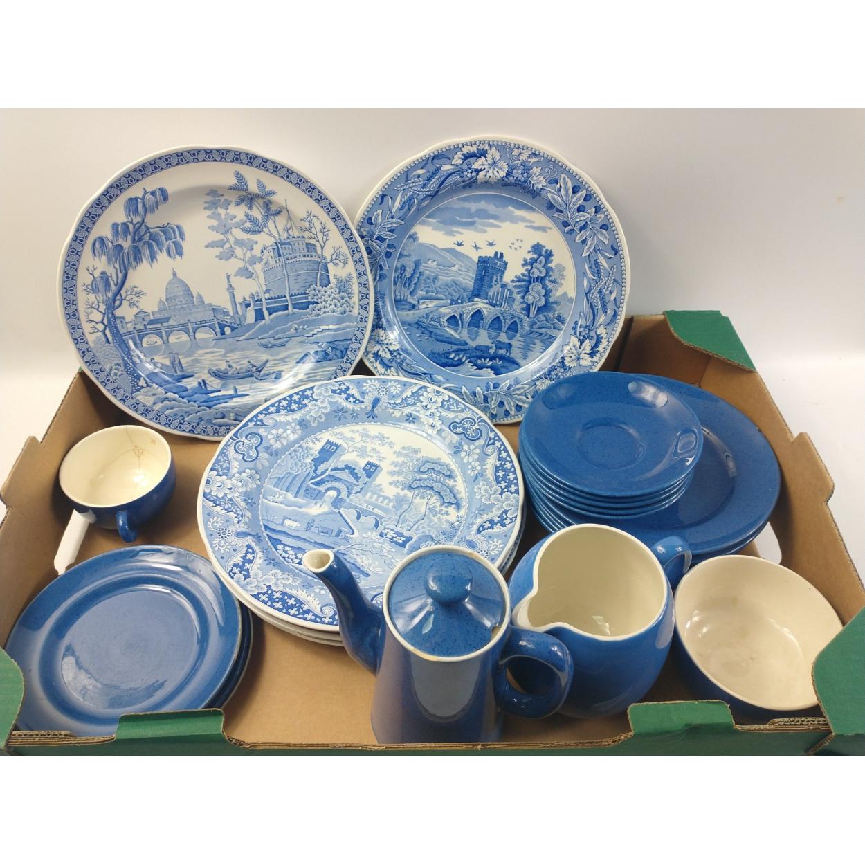 A tray of blue pottery crockery plus five SPODE plates (27cm dia)