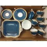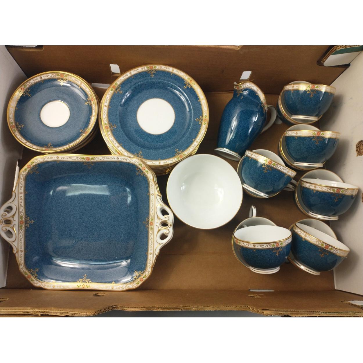 A ROYAL WORCESTER tea service in blue with gilt edging comprising 11 teacups, 11 saucers, 11 side plates, 2 cake plates, 1 milk jug and 1 large sugar bowl, good condition