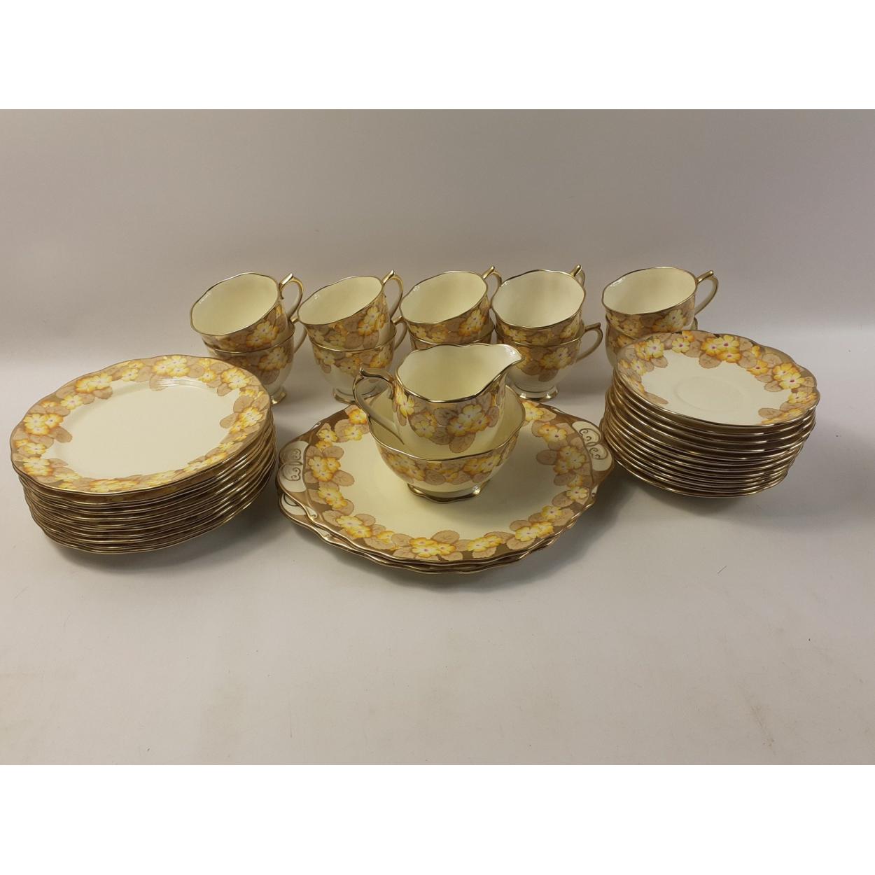 A ROYAL ALBERT Primrose tea service to include 10 cups (1 with small crack), 12 saucers, 11 side plates, 2 cake plates, 1 milk jug and 1 sugar bowl