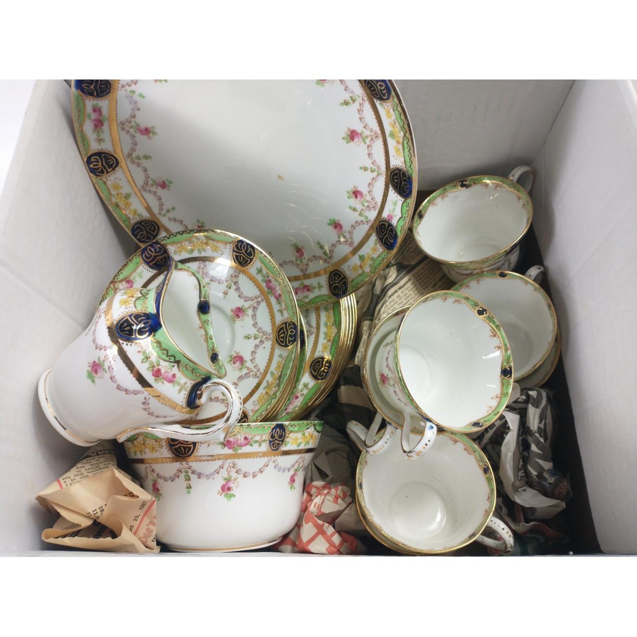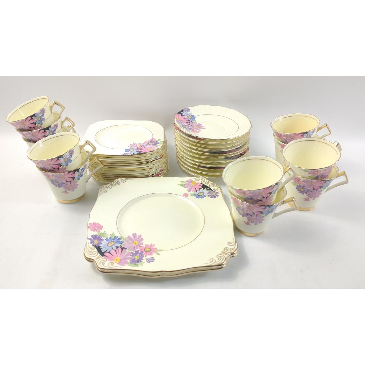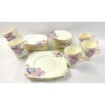 Stunning! - 1920/30s Art Deco flowers and grapes SHELLEY Queen Anne twelve place tea service in fine bone china comprising twelve cups(One damage repaired but intact) with twelve saucers and a butter dish? from a similar set one that doesn't match) , twelve side plates and two large sandwich / cake plates with a sugar and cream. 41 pieces in total. Beautifully hand painted Rd. 723404 Artist ref. 11574. A Beautifully presented set in lovely condition.