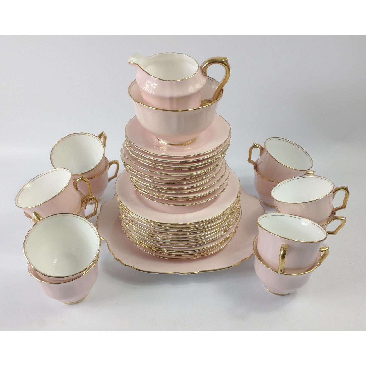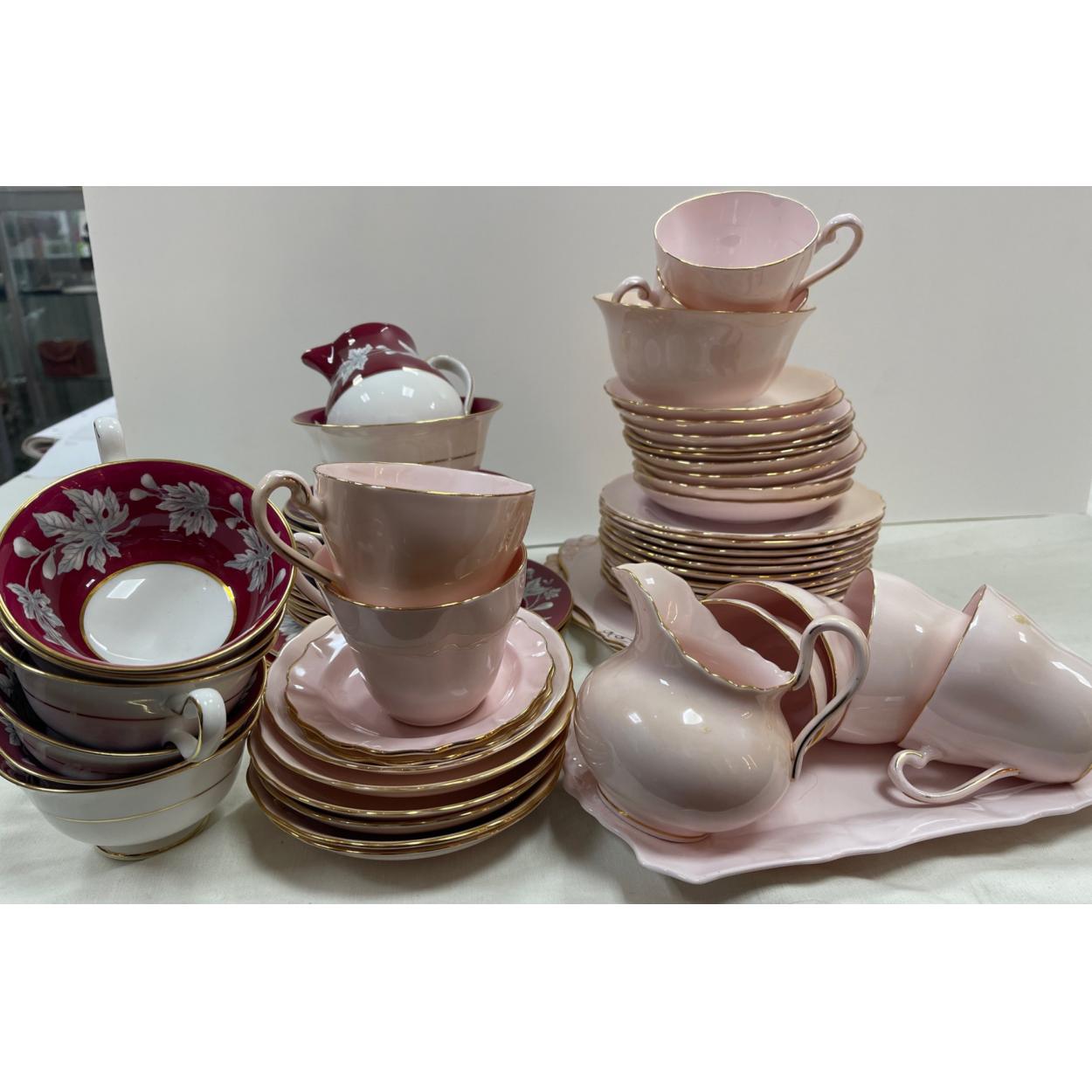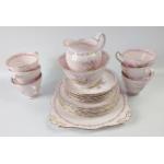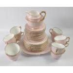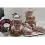 Pretty in pink - a CROWN STAFFORDSHIRE tea service in pink with gilt edging to include, 12 teacups, 12 saucers, 12 side plates, 1 cake plate, 1 milk jug and 1 sugar bowl, good condition