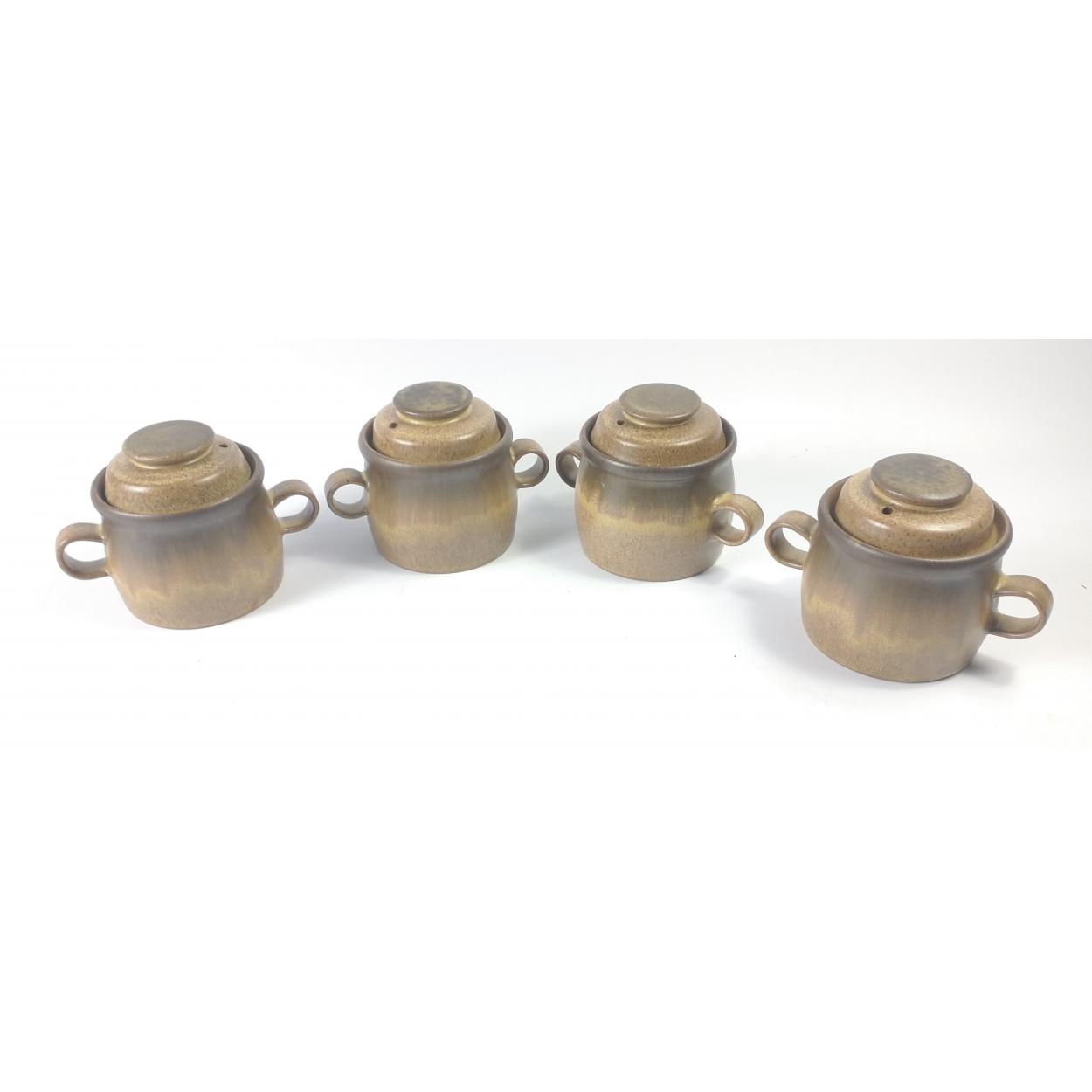 Four vintage DENBY twin-handled soup pots 8cm high, plus lid