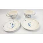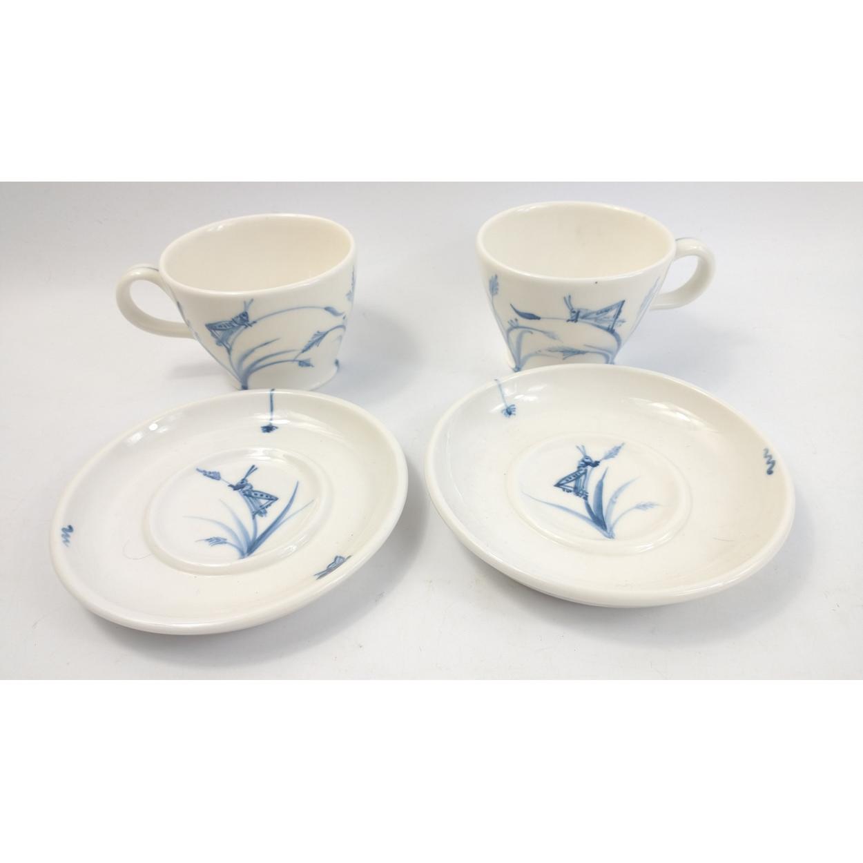 A pair of blue and white studio pottery cups and saucers by MIA SAROSI decorated with grasshoppers