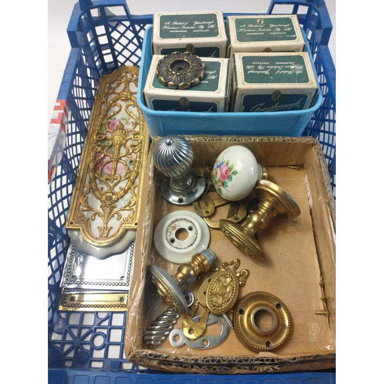 A tray of door furniture to include 10 boxes of GAINSBOROUGH door handle plates, and various door knobs and door protectors