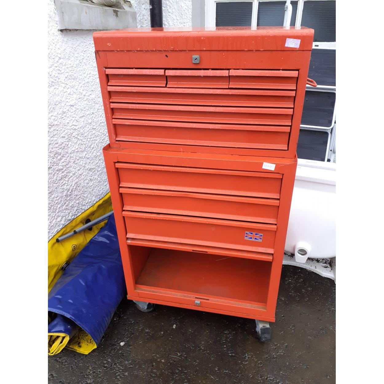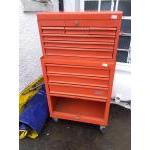 A large wheeled red drawer tool chest and a separate one that sits on top. Seen service but still lots of life in them.