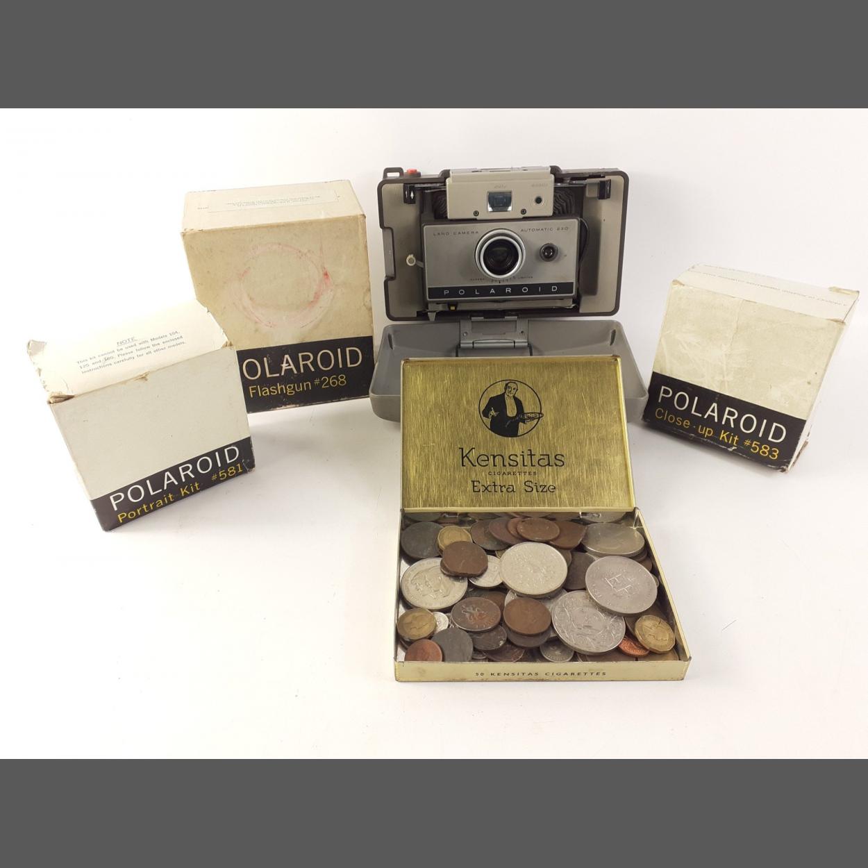 A vintage POLAROID land camera 230 with a Flashgun (268), portrait kit (581) and a close-up kit (583) and a small box of obsolete UK coinage and some royal commemorative coins