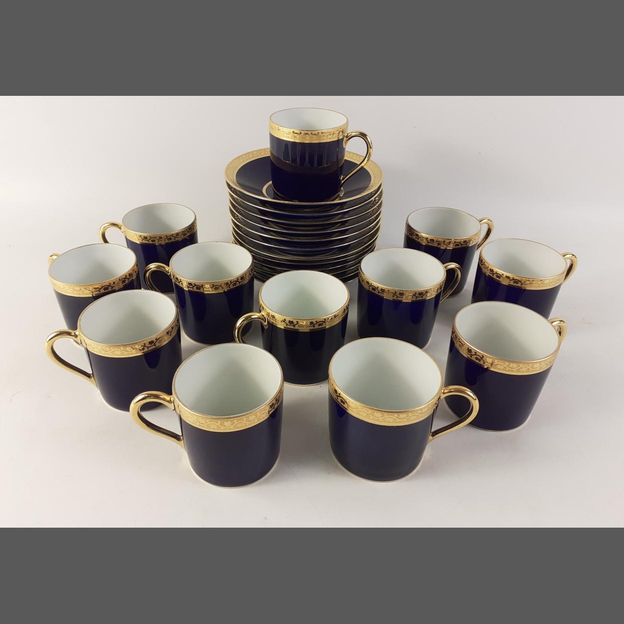 A LIMOGES coffee service in navy blue with gilt handles and rims comprising 12 each of coffee cans and saucers. No visible damage
