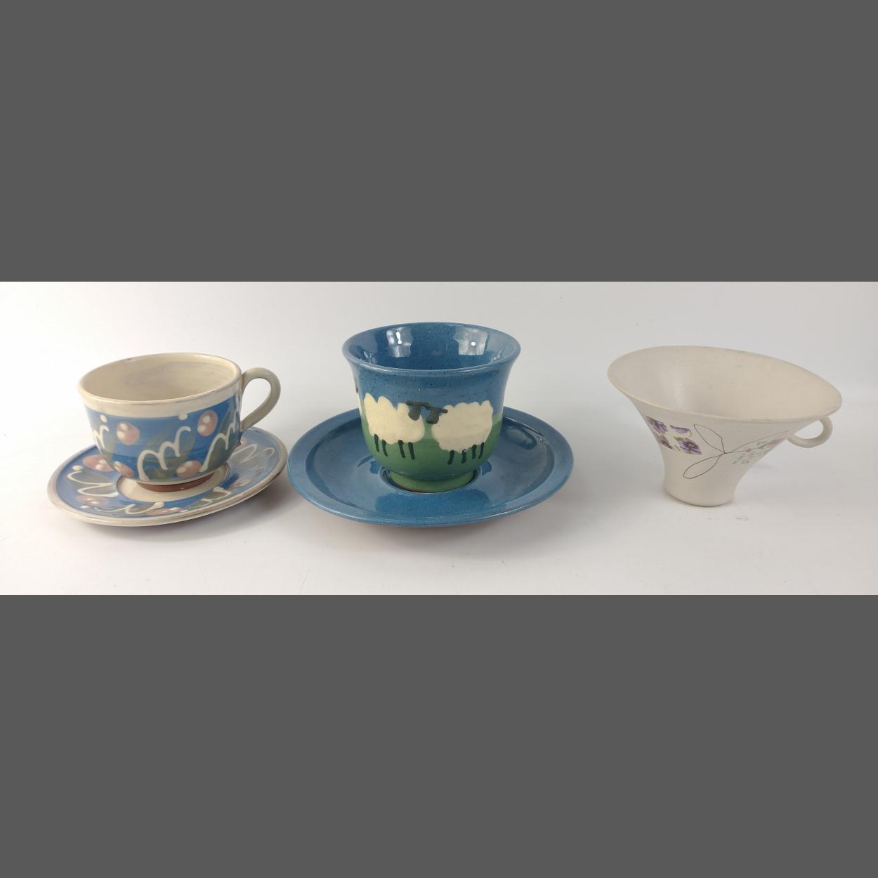 Two pottery cups and saucers one with sheep (saucer 18cm dia, cup 9cm high) and a cup by KARIN ERIKSSON of Sweden