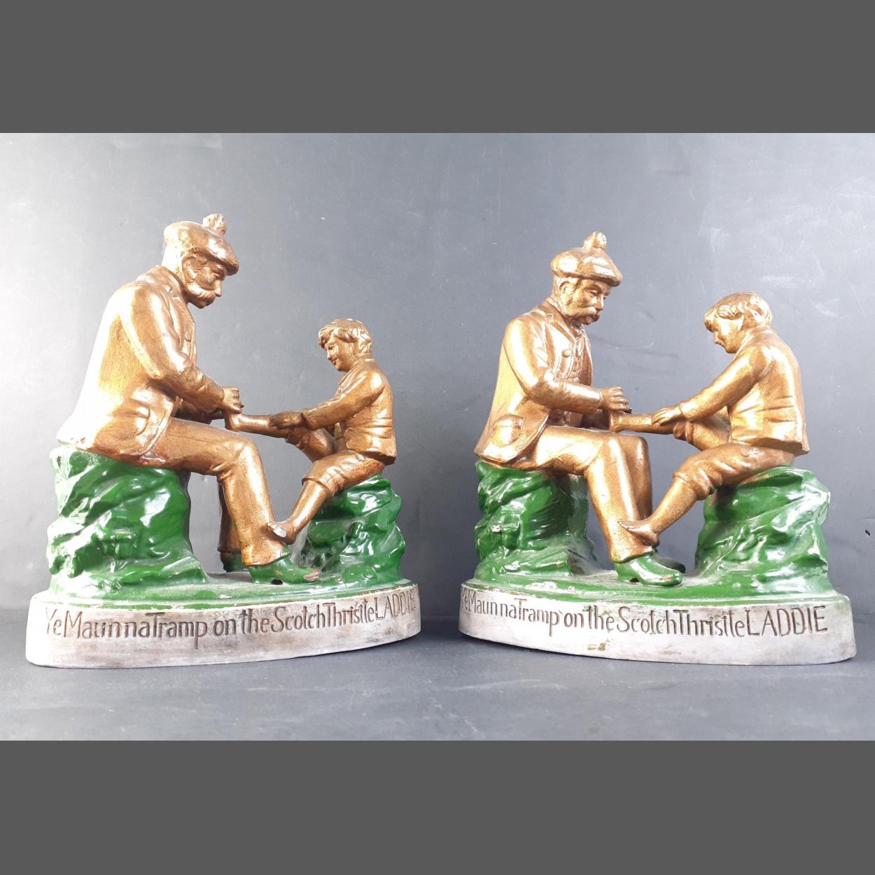 A pair of ceramic figurines of "Ye Maunna Tramp on the Scotch Thistle Laddie" each standing 23cm high with a stamp 2423 on rear. There are some chips from the paintwork and 1 small chip from 1 foot but generally good condition for their age