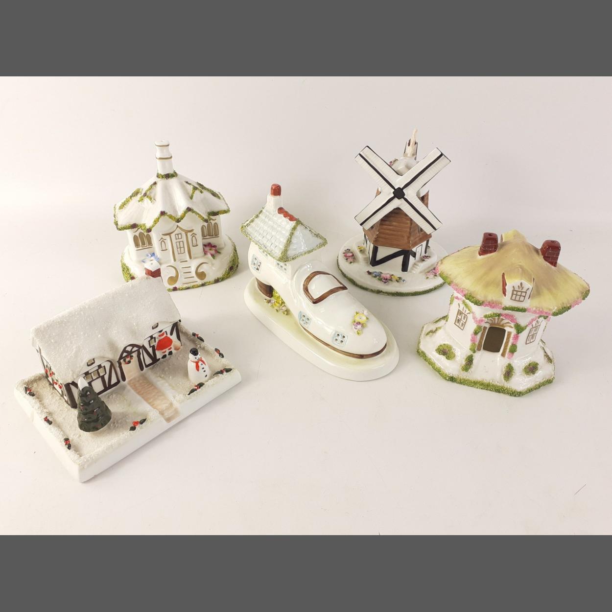 A COALPORT Fine Bone China collection. A lovely selection of 5 decorative pieces to include "Christmas Cottage" measuring approx. L12cm x W10cm x H8cm, "The Gate House" measuring approx. L10cm x W7cm x H12.5cm ", "The Old Woman's Shoe" measuring approx. L16cm x W7cm x H11cm, "The Windmill" measuring approx. 11cm in diameter x H13.5cm and "Thatched Cottage" measuring approx. L10cm x W7.5cm x H11.5cm. All pieces are in excellent condition.