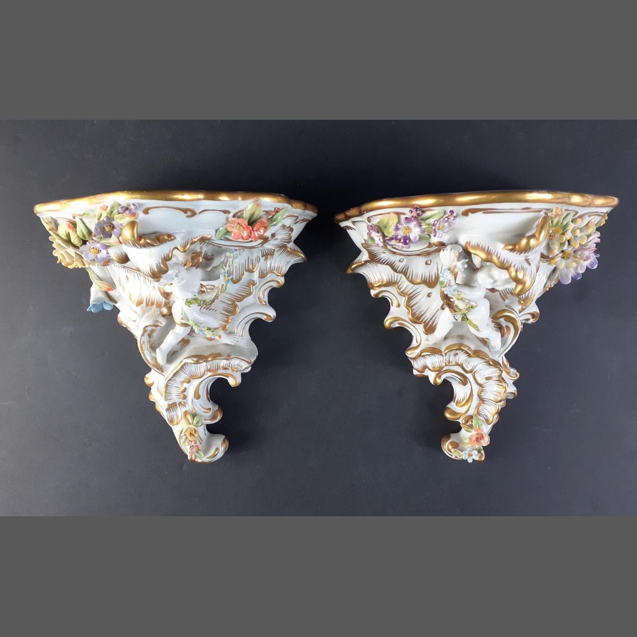 A pair of ROYAL CROWN DERBY wall sconces with cherubs, garlands and flowers each 16cm high, one flower missing