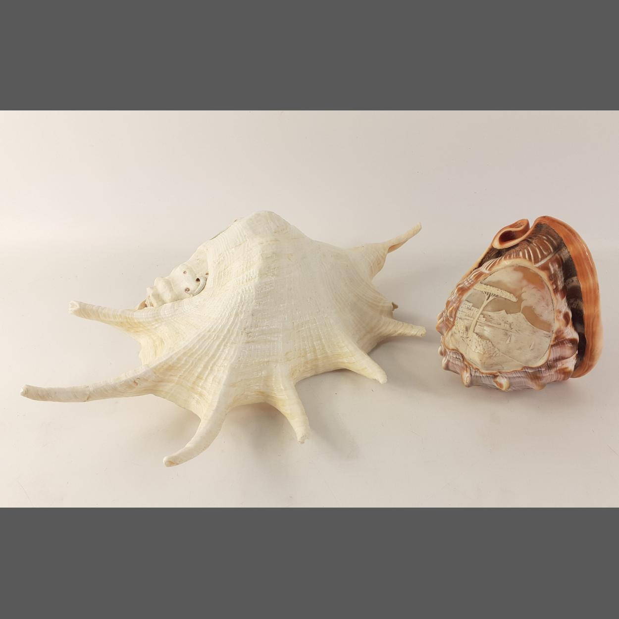 Two conch shells one 36cm long, the other 13cm with a carved seaside scene with volcano in background