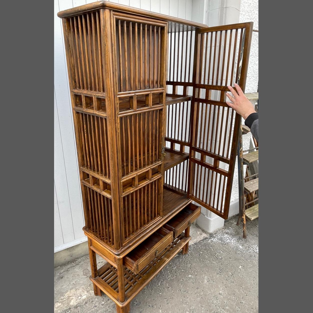 A tall ORIENTAL display cabinet/bookcase with three shelves and two drawers and a further storage shelf with two opening doors concealing items within! - dimensions 176cm tall x 78cm wide x 28cm depth approx commissioned & imported from the ORIENT - it comes apart in two parts for ease of transport