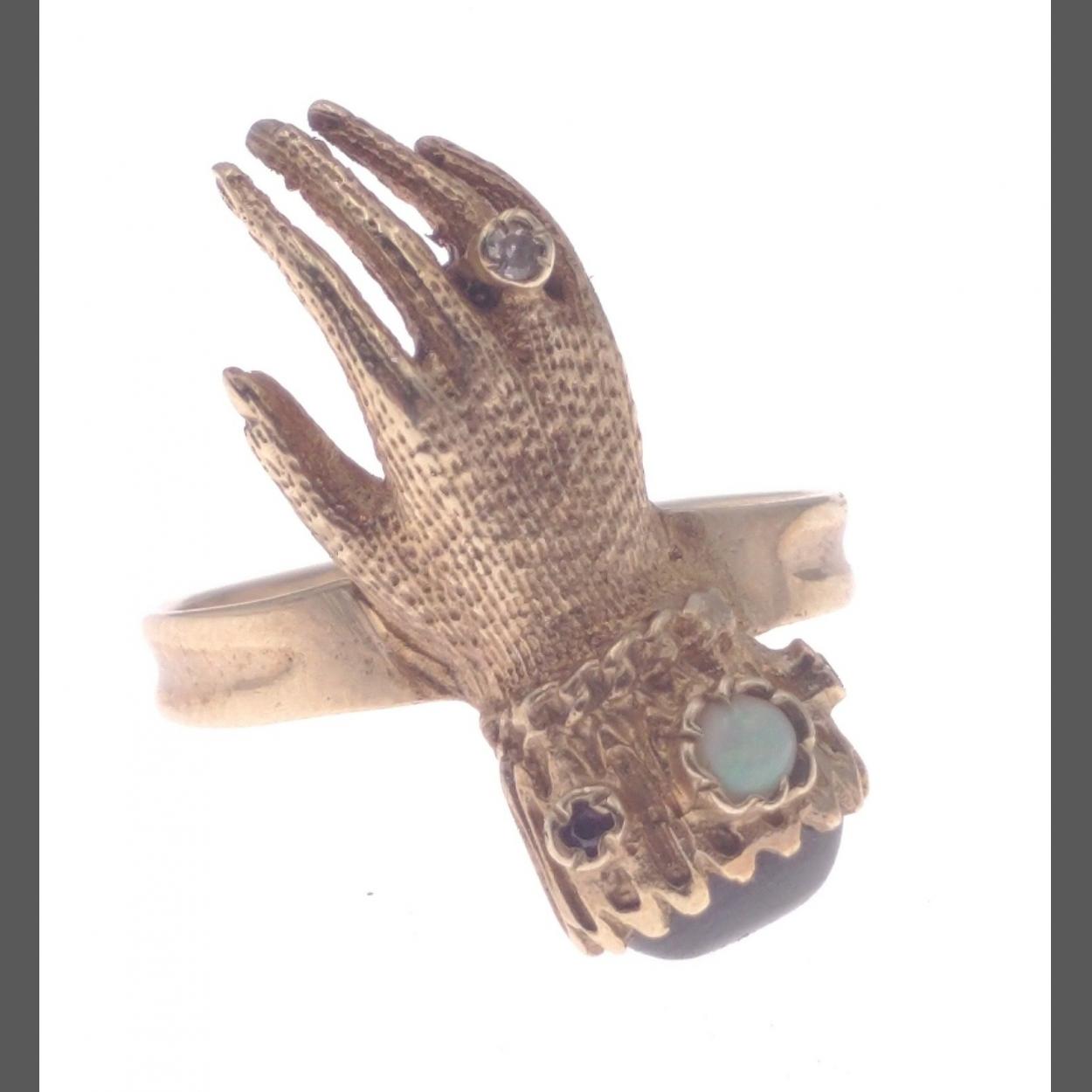 A stunning 9ct gold ring in the shape of a hand with diamond ring on finger and stones to cuff. Very reminiscent of Victorian age jewellery but the hallmarks are for London 1973. A truly stunning high quality, red stone possibly ruby in the cuff. Size N. Total gross weight 4.25g approx