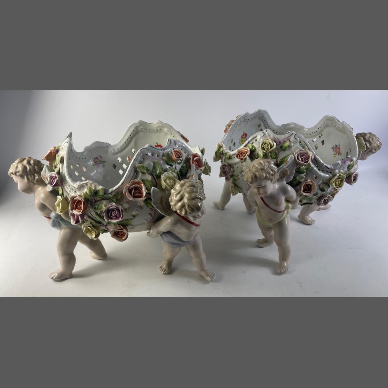 EXQUISITE! A pair of SUBSTANTIAL SITZENDORF porcelain colourful bowls with standing CHERUB figures 19TH CENTURY, (marked with underglaze blue cross swords stamped on one item) - dimensions each 26cm height x 30cm diameter approx -(I) have looked over both items and remarkably cannot find any chips off the flowers cracks but there has been damage repair of one of the cherubs heads (on the unstamped model) - this has been cleverly repaired and in no way detracts from this beautiful item - see pic within pic library
