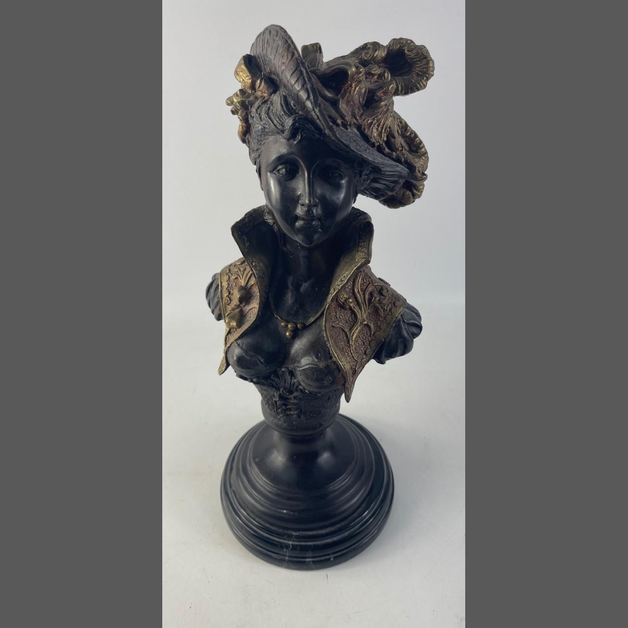 Erte (Russian 1892-1990) stamped to the base edge - a Victorian Era Woman in a feathered hat bronze sculpture on a marble base - this is a substantial bust and dimensions are 15" tall x 7" wide approx