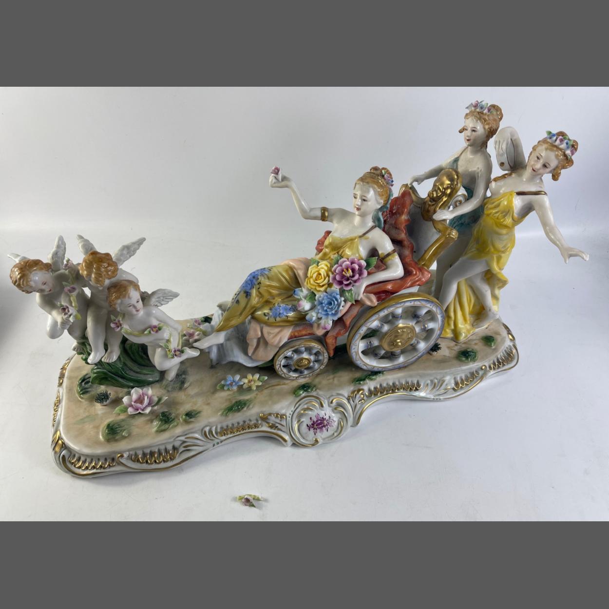 DRESDEN RICHARD KLEMM (1869-1916) large porcelain table centrepiece ornament with cherubs pulling a wheeled chair supported with two classical ladies all adorned with flowers - BEAUTIFUL! - this item is in remarkable condition for its age! Stamped to base - one tiny flower broken-off (I cannot see where it goes ! dimensions length 50cm x 18cm width DRESDEN RICHARD KLEMM stamped large ornament cherubs pulling a wheeled chair helped by two classical ladies - dimensions 50cm x 18cm depth x 27cm height approx - there is one tiny rose-bud which comes with this piece, see pics attached ( I couldn't for the life of me find out where it fixes to!!)