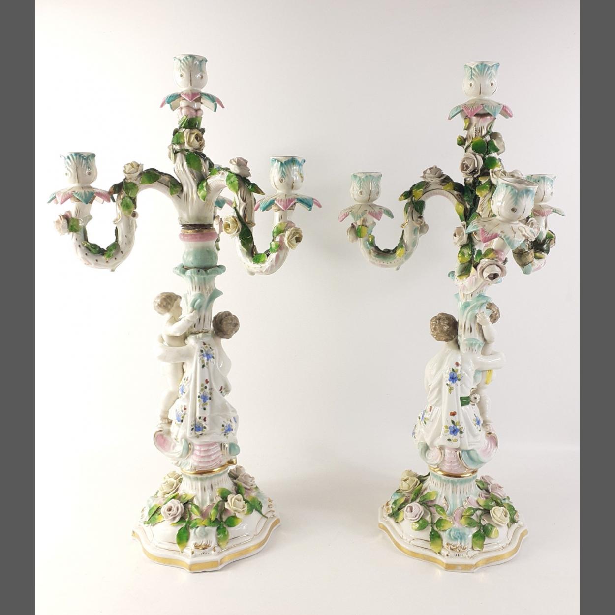 A pair of DRESDEN over-glazed blue crossed swords stamped to base porcelain three branch candelabra c1890 adorned with flowers with mother and child - both candelabra have sustained damage/repairs to the separation part of the stems, and one of the arms has been damaged repaired on one candelabra, and on the other candelabra there is wire-work to support the stem - otherwise no chips detected on any of the edges or flowers - height of both is 52cm height x 25cm width approx