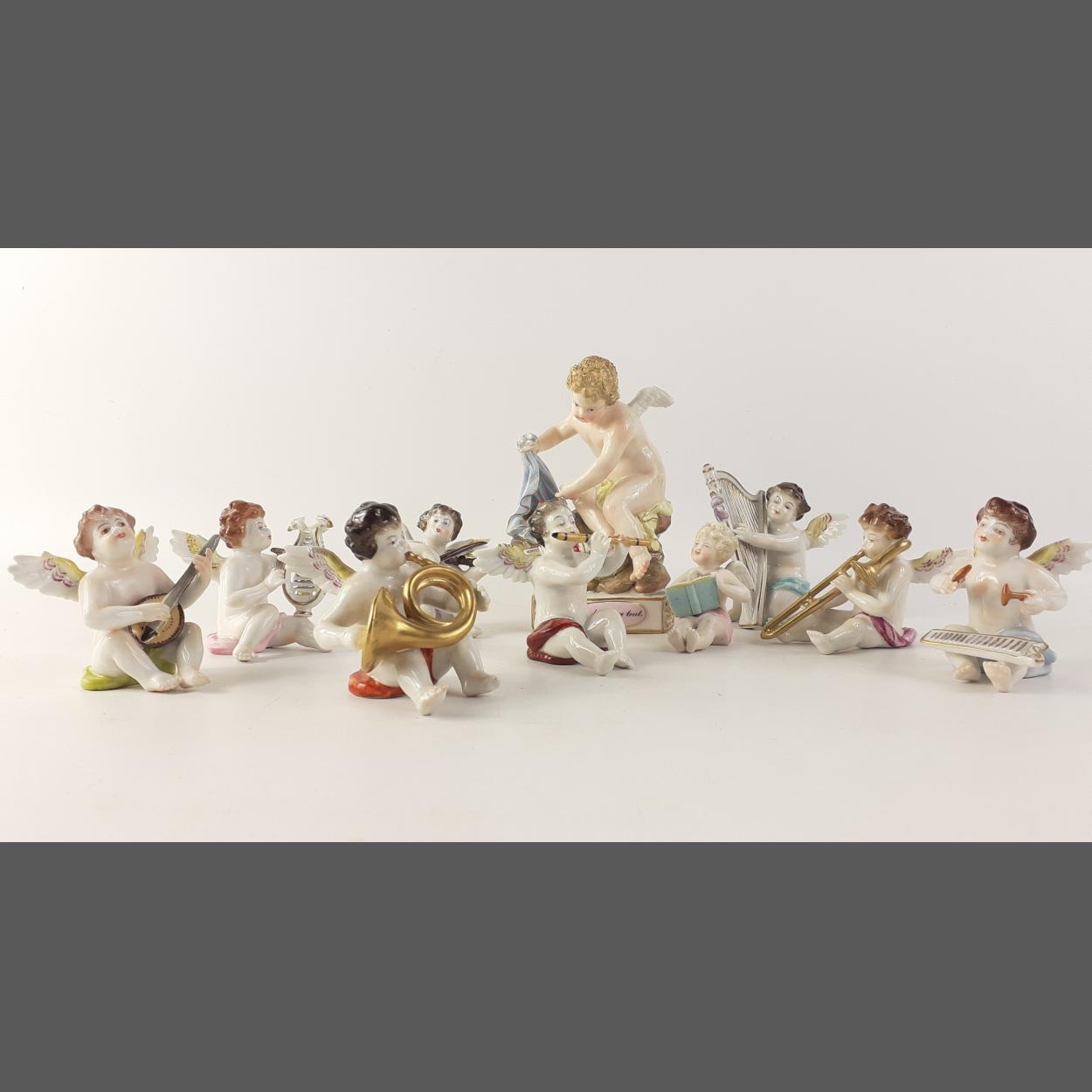 A heavenly orchestra - eight cherubs each playing a different instrument including a lyre, flute and trombone all stamped with a blue crown 1762 to base plus 2 other cherubs. Tallest approx 12cm
